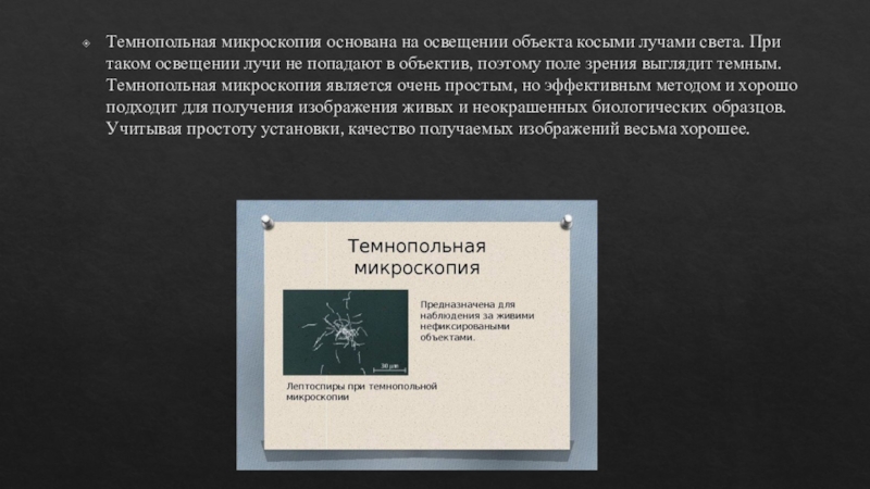 Слайд 7Темнопольная микроскопия основана на освещении объекта косыми лучами света. При