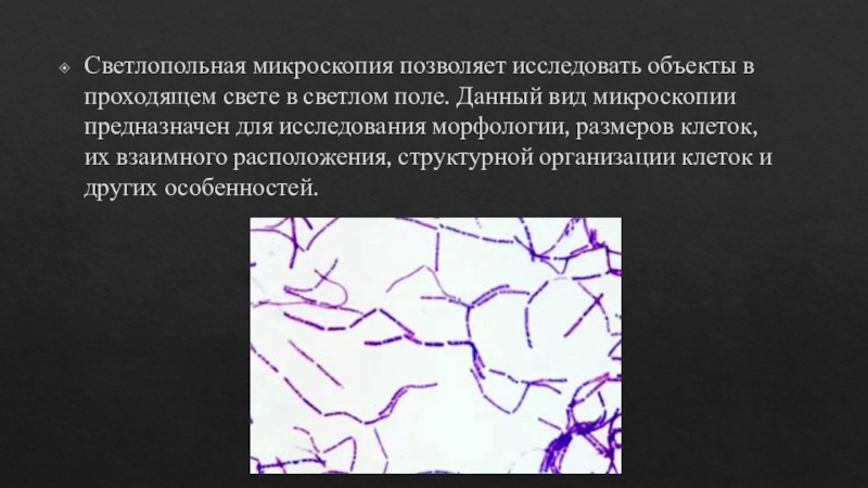 Слайд 5Светлопольная микроскопия позволяет исследовать объекты в проходящем свете в светлом
