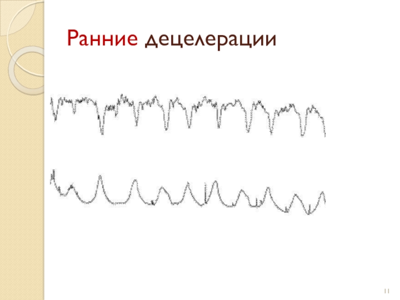 Длительность и амплитуда ранних децелераций соответствуют длительности и интенсивности схватки. Ранние децелерации представляют собой рефлекторную реакцию плода на кратковременную ишемию головного мозга вследствие сдавления головки плода во время схватки. В отсутствие других патологических изменений на кардиотокограмме ранние децелерации не считают признаком гипоксии.
