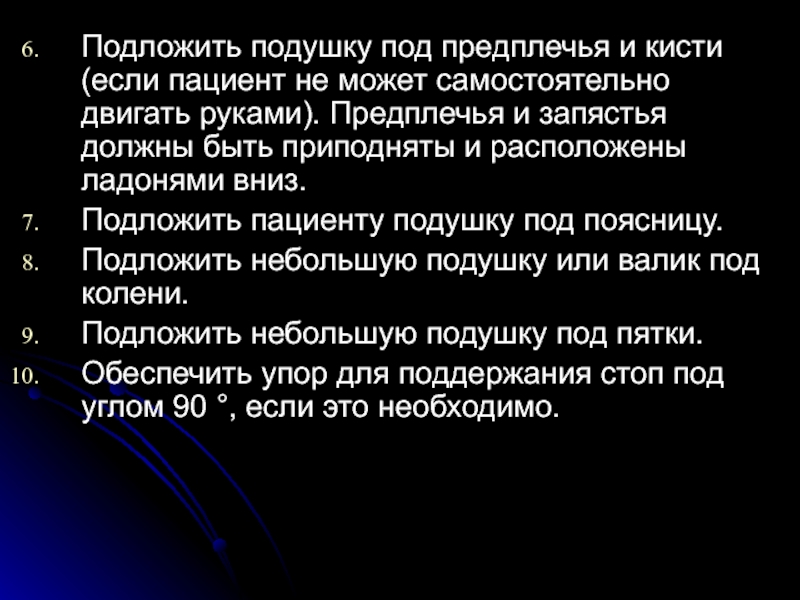Слайд 6Подложить подушку под предплечья и кисти (если пациент не может