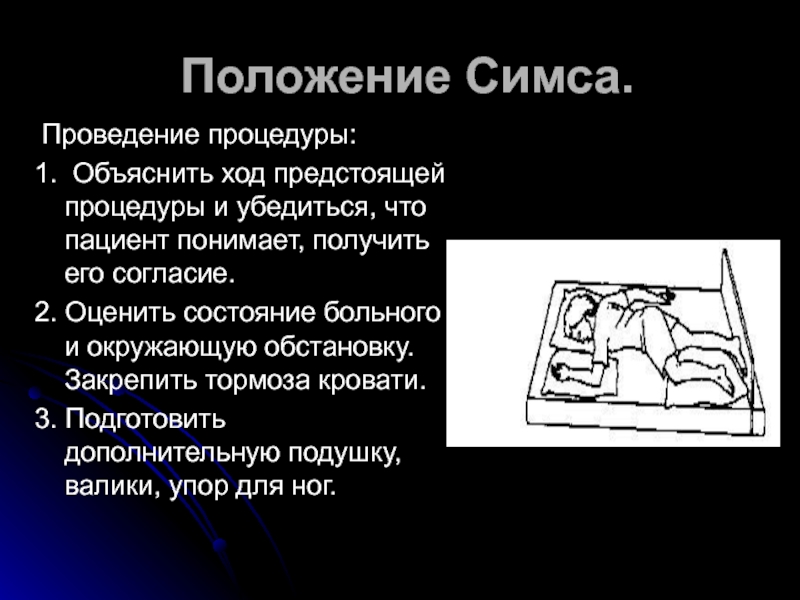 Слайд 1Различные функциональные положения пациента в постели: положение Симса, положение на