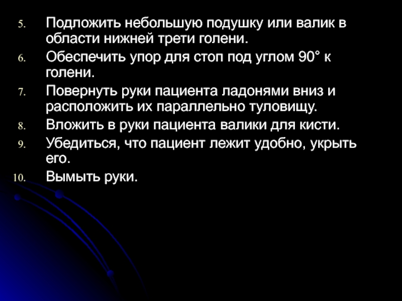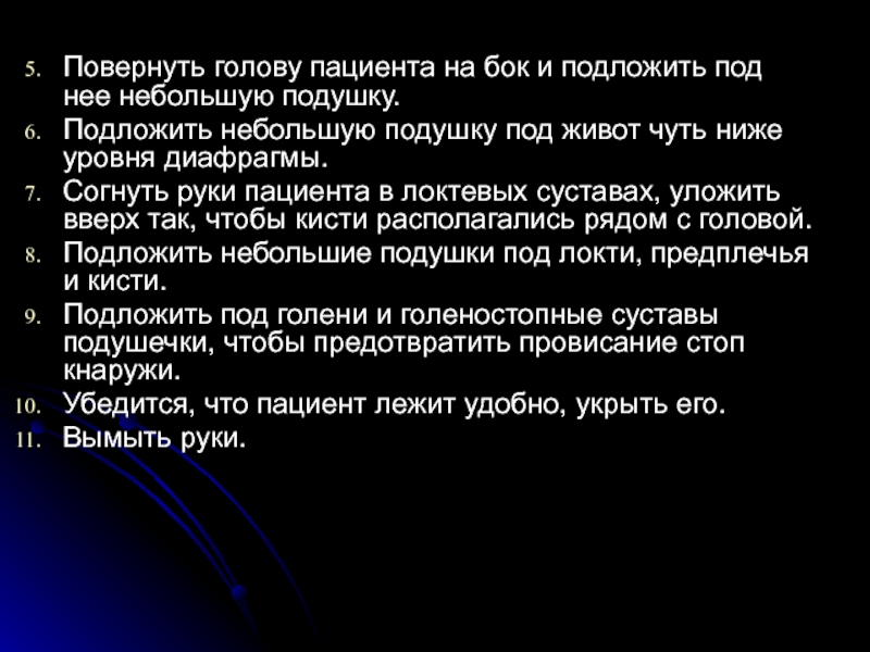 Придать обеим рукам пациента слегка согнутое положение (рука, находящаяся сверху, лежит на животе, фиксированная подушкой; рука, находящаяся снизу, лежит на подушке рядом с головой).