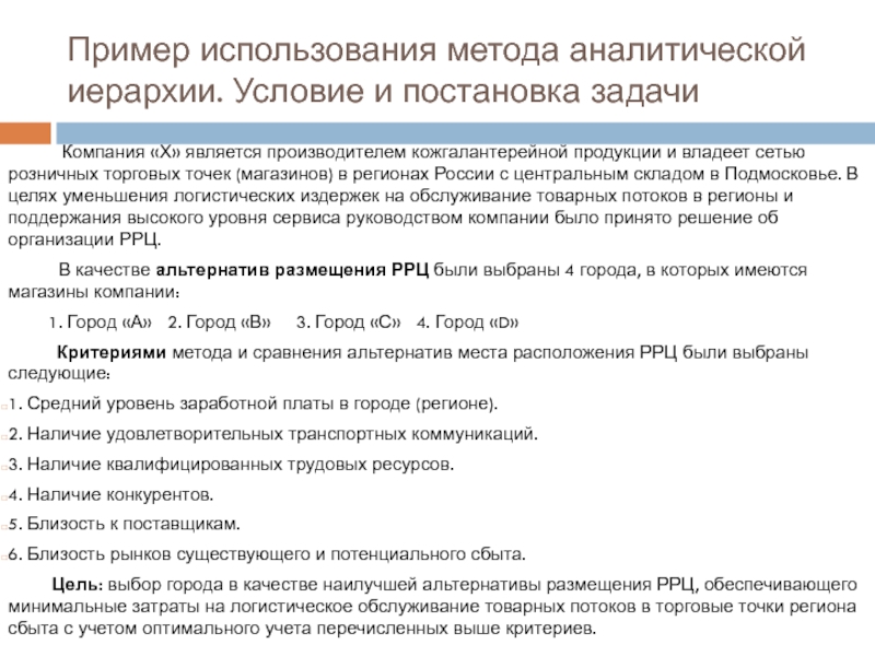 Общий вид постановки задачи для оптимизации логистических решений с помощью МАИ: Задана общая цель (или цели) функционирования соответствующей системы (решения задачи).