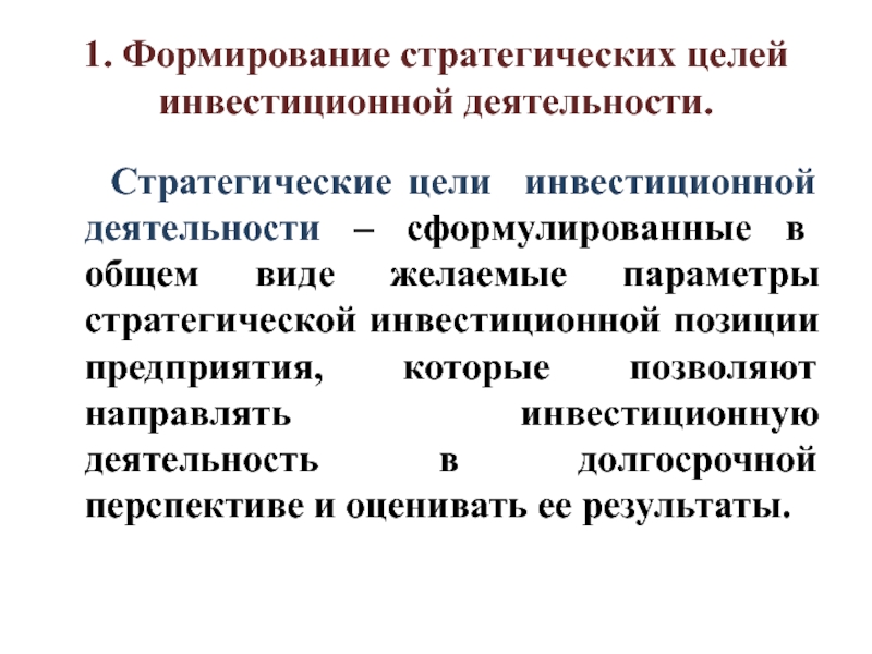 деятельности – сформулированные в общем виде желаемые параметры стратегической инвестиционной