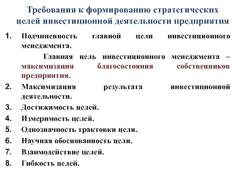 Слайд 3Требования к формированию стратегических целей инвестиционной деятельности предприятия
