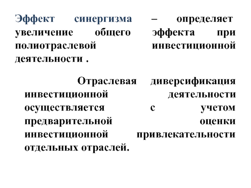 Слайд 17Эффект синергизма – определяет увеличение общего эффекта при полиотраслевой инвестиционной