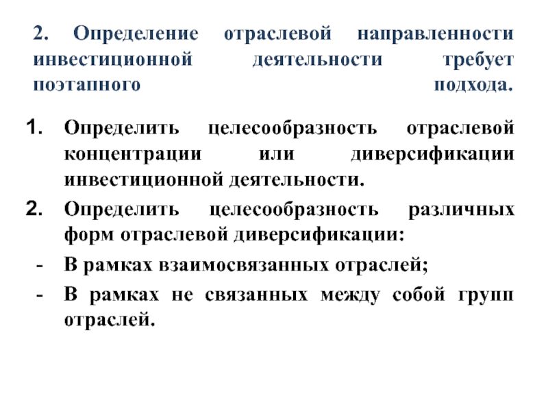 2. Определение отраслевой направленности инвестиционной деятельности требует поэтапного подхода.