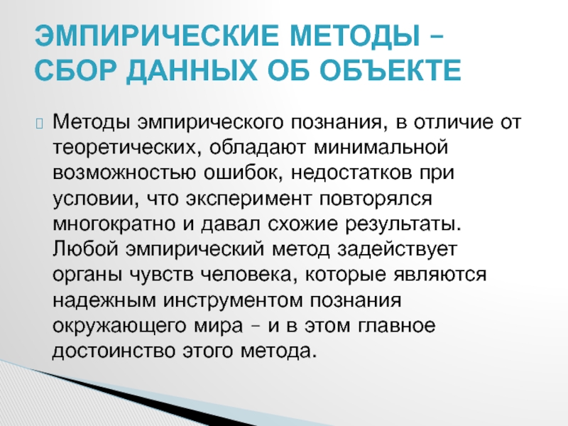 схожие результаты. Любой эмпирический метод задействует органы чувств человека, которые являются надежным инструментом познания окружающего мира – и в этом главное достоинство этого метода.Эмпирические методы – сбор данных об объекте