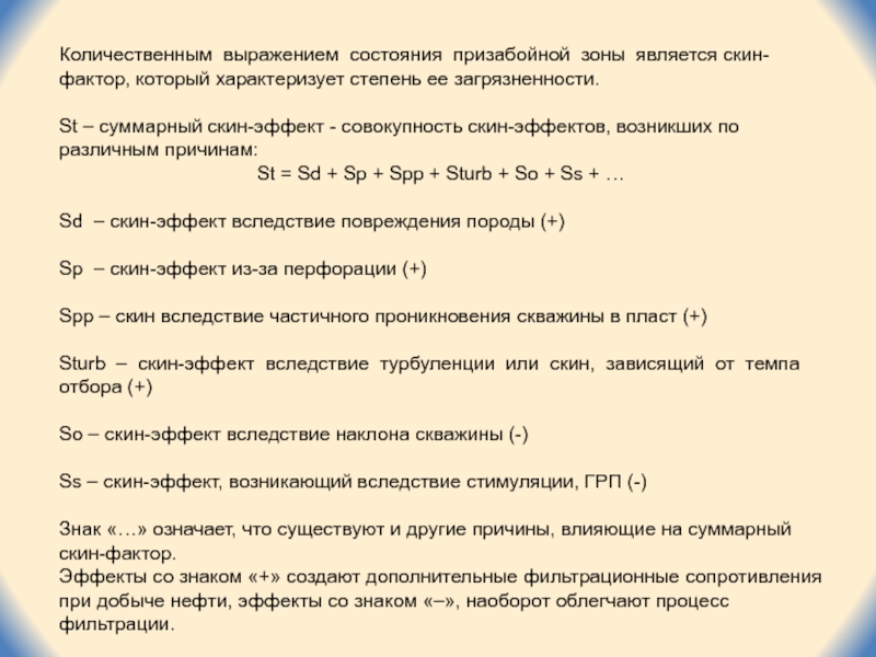 Слайд 5Количественным выражением состояния призабойной зоны является скин-фактор, который характеризует степень