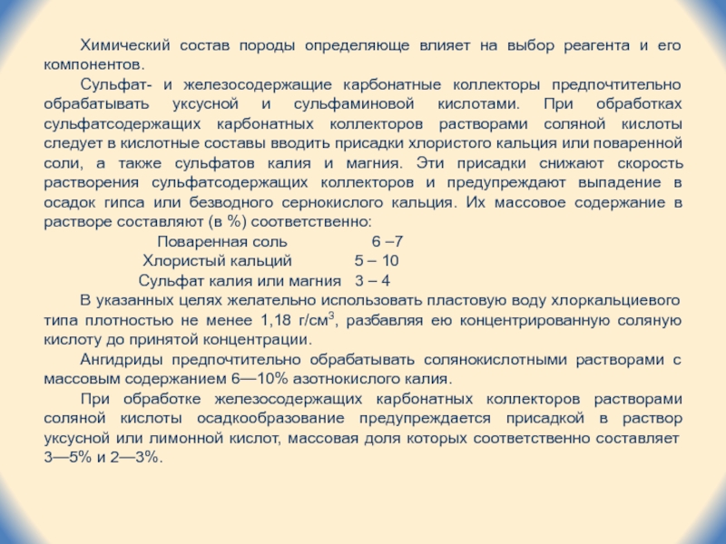 Сульфат- и железосодержащие карбонатные коллекторы предпочтительно обрабатывать уксусной и сульфаминовой