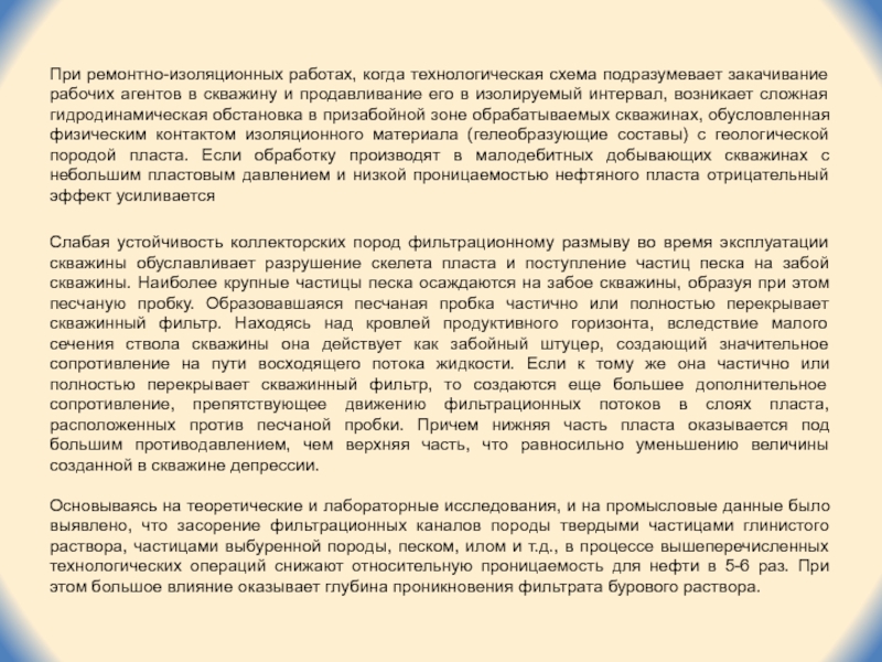 Основываясь на теоретические и лабораторные исследования, и на промысловые данные было выявлено, что засорение фильтрационных каналов породы твердыми частицами глинистого раствора, частицами выбуренной породы, песком, илом и т.д., в процессе вышеперечисленных технологических операций снижают относительную проницаемость для нефти в 5-6 раз. При этом большое влияние оказывает глубина проникновения фильтрата бурового раствора.
