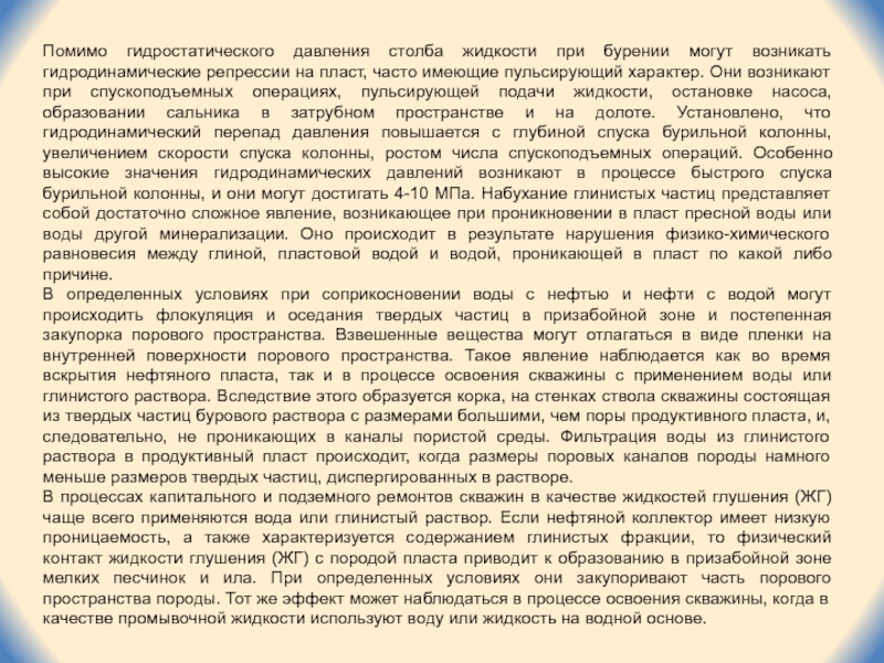 Во время вскрытия продуктивного пласта бурением происходит проникновение глинистых частиц из бурового раствора в приводящие фильтрационные каналы породы. Как правило, продуктивные пласты вскрываются при давлениях, значительно превышающие пластовое. Для предотвращения нефтегазопроявлений при бурении приходится создавать гиростатическое давление столба жидкости (бурового раствора), значительно превышающее пластовое давление. Величина гидростатической репрессии зависит от плотности бурового раствора, высоты столба жидкости и пластового давления.