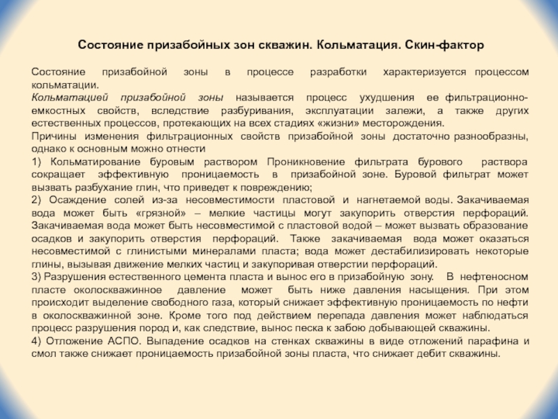 Слайд 4Состояние призабойных зон скважин. Кольматация. Скин-фактор