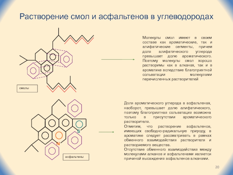 Слайд 20Растворение смол и асфальтенов в углеводородах