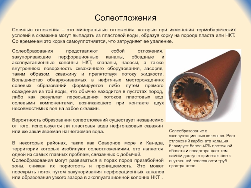 Солеобразования представляют собой отложения, закупоривающие перфорационные каналы, обсадные и эксплуатационные колонны НКТ, клапаны, насосы, а также внутреннюю поверхность скважинного оборудования, засоряя, таким образом, скважину и препятствуя потоку жидкости. Большинство обнаруживаемых в нефтяных месторождениях солевых образований формируется либо путем прямого осаждения из той воды, что обычно находится в пустотах пород, либо как результат пересыщения потоков пластовых вод солевыми компонентами, возникающего при контакте двух несовместимых вод на забое скважин.