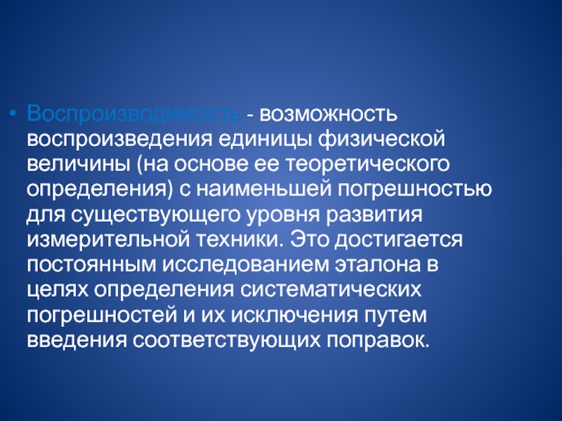Слайд 63Воспроизводимость - возможность воспроизведения единицы физической величины (на основе ее