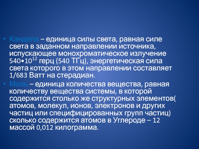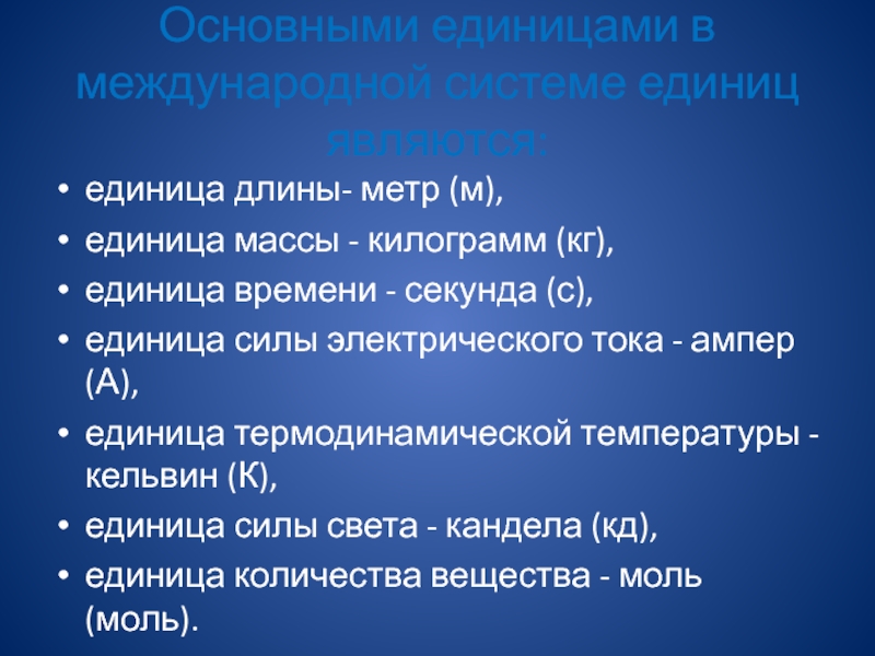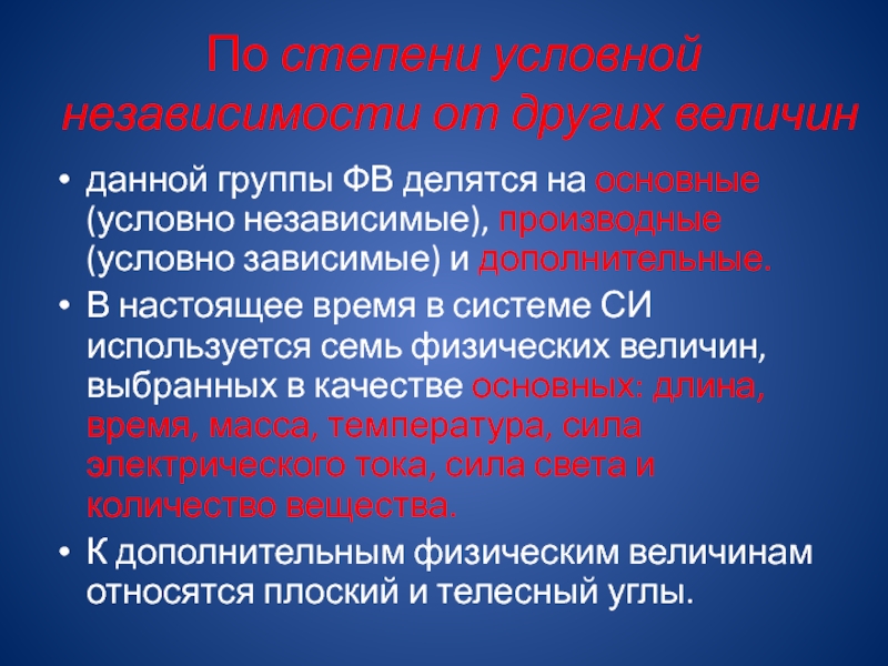 В настоящее время в системе СИ используется семь физических величин, выбранных в качестве основных: длина, время, масса, температура, сила электрического тока, сила света и количество вещества.