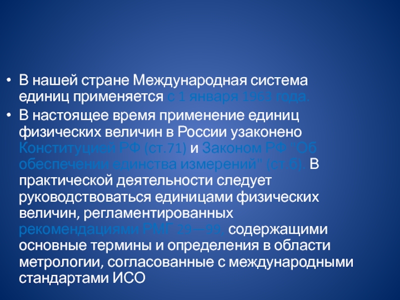 узаконено Конституцией РФ (ст.71) и Законом РФ "Об обеспечении единства измерений" (ст.б). В практической деятельности следует руководствоваться единицами физических величин, регламентированных рекомендациями РМГ 29—99, содержащими основные термины и определения в области метрологии, согласованные с международными стандартами ИСО