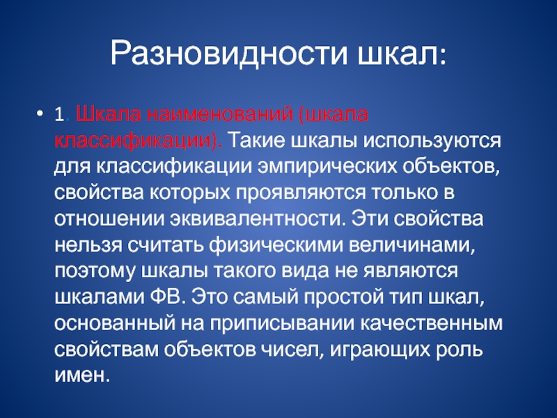 1. Шкала наименований (шкала классификации). Такие шкалы используются для
