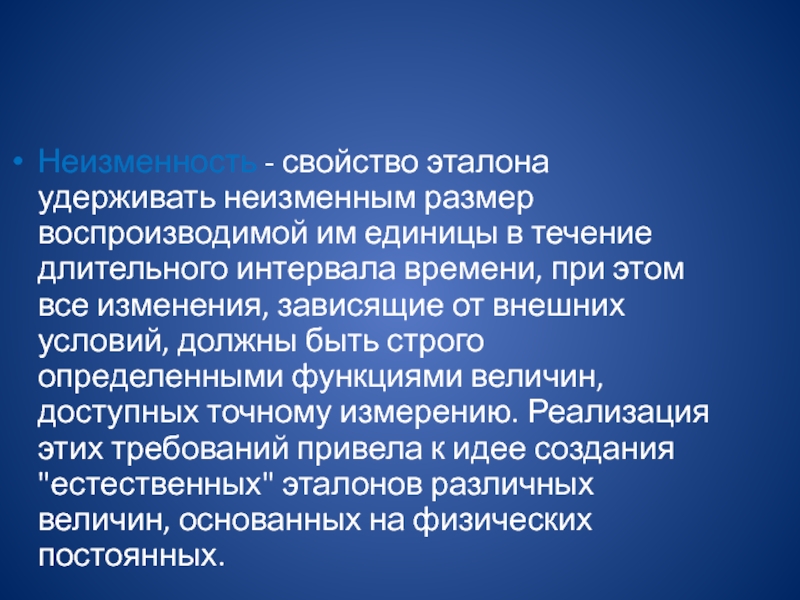 Слайд 64Неизменность - свойство эталона удерживать неизменным размер воспроизводимой им единицы