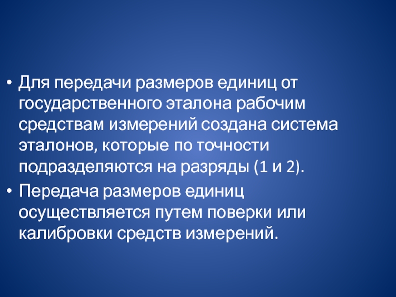 Слайд 76Для передачи размеров единиц от государственного эталона рабочим средствам измерений
