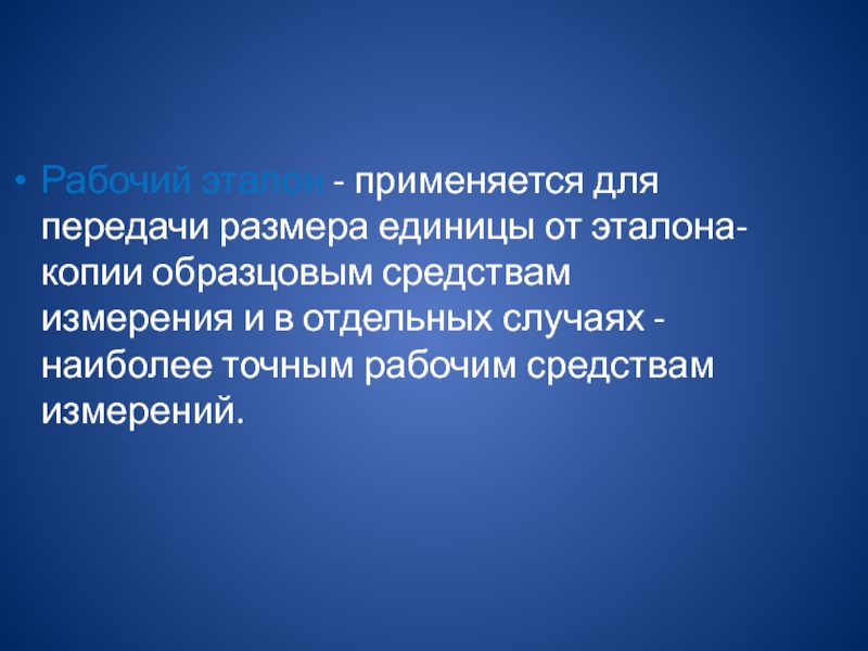 Слайд 73Рабочий эталон - применяется для передачи размера единицы от эталона-копии