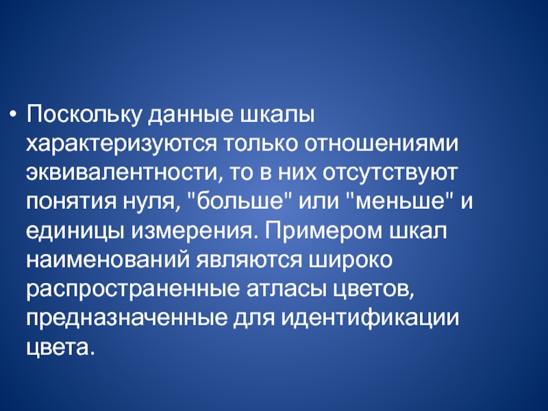 Слайд 18Поскольку данные шкалы характеризуются только отношениями эквивалентности, то в них