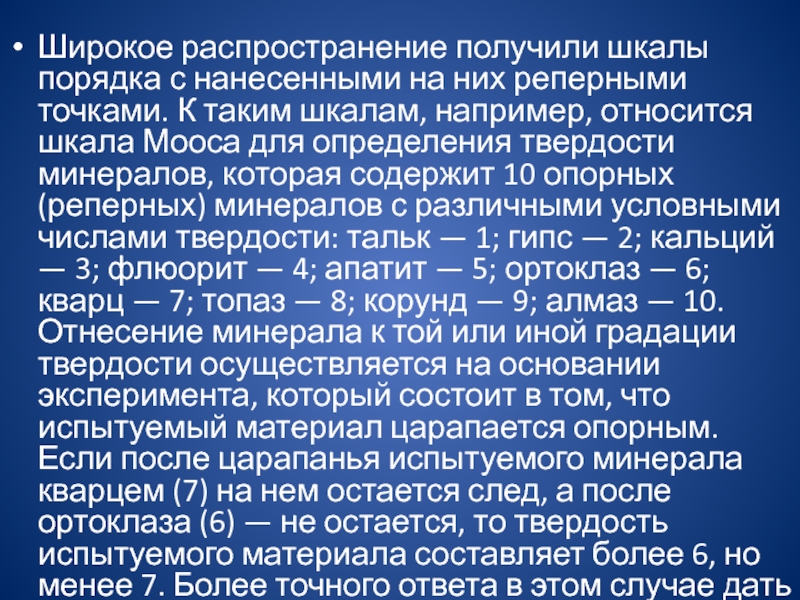твердости минералов, которая содержит 10 опорных (реперных) минералов с различными условными числами твердости: тальк — 1; гипс — 2; кальций — 3; флюорит — 4; апатит — 5; ортоклаз — 6; кварц — 7; топаз — 8; корунд — 9; алмаз — 10. Отнесение минерала к той или иной градации твердости осуществляется на основании эксперимента, который состоит в том, что испытуемый материал царапается опорным. Если после царапанья испытуемого минерала кварцем (7) на нем остается след, а после ортоклаза (6) — не остается, то твердость испытуемого материала составляет более 6, но менее 7. Более точного ответа в этом случае дать невозможно.