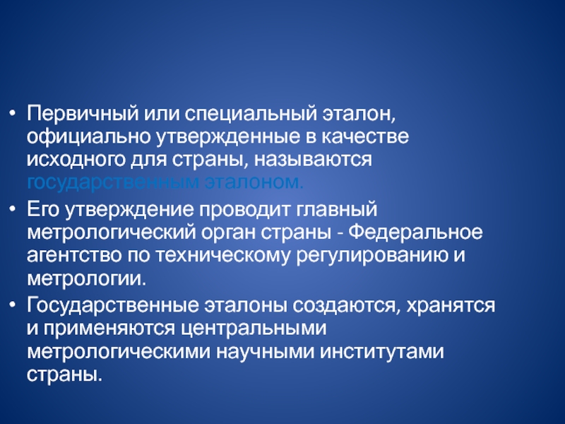 Слайд 69Первичный или специальный эталон, официально утвержденные в качестве исходного для