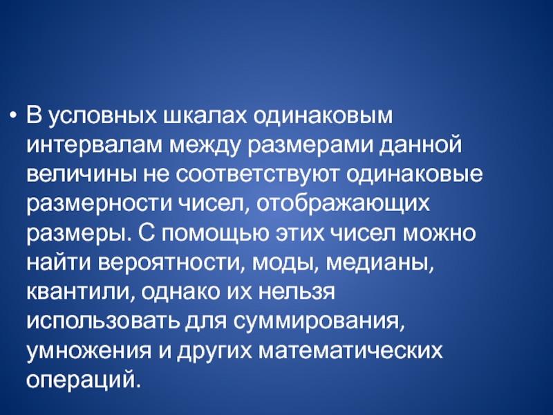 Слайд 22В условных шкалах одинаковым интервалам между размерами данной величины не