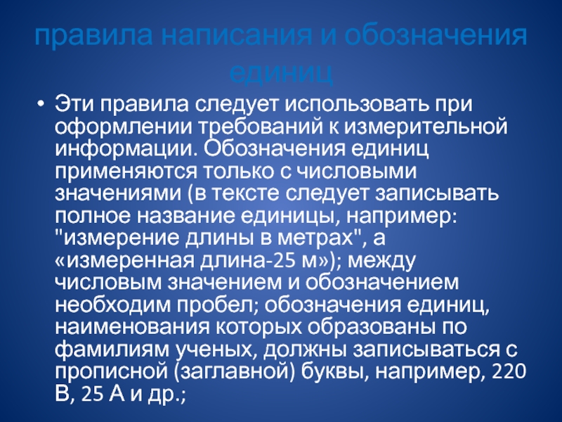 значениями (в тексте следует записывать полное название единицы, например: "измерение длины в метрах", а «измеренная длина-25 м»); между числовым значением и обозначением необходим пробел; обозначения единиц, наименования которых образованы по фамилиям ученых, должны записываться с прописной (заглавной) буквы, например, 220 В, 25 А и др.;