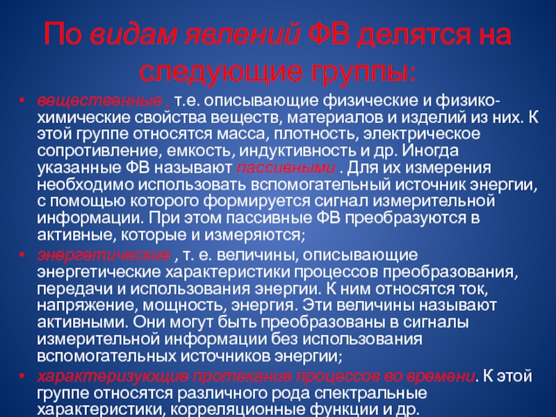 из них. К этой группе относятся масса, плотность, электрическое сопротивление, емкость, индуктивность и др. Иногда указанные ФВ называют пассивными . Для их измерения необходимо использовать вспомогательный источник энергии, с помощью которого формируется сигнал измерительной информации. При этом пассивные ФВ преобразуются в активные, которые и измеряются;