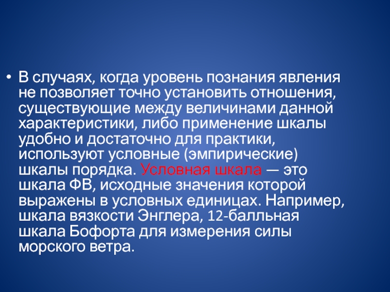 и достаточно для практики, используют условные (эмпирические) шкалы порядка. Условная шкала — это шкала ФВ, исходные значения которой выражены в условных единицах. Например, шкала вязкости Энглера, 12-балльная шкала Бофорта для измерения силы морского ветра.