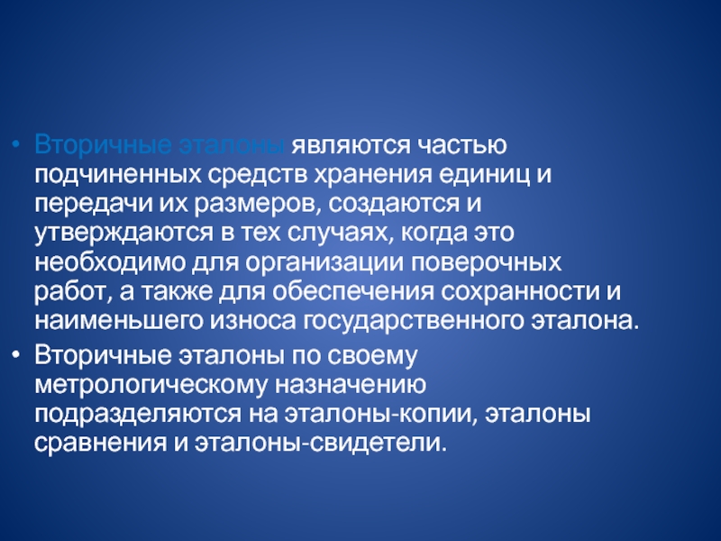 Слайд 71Вторичные эталоны являются частью подчиненных средств хранения единиц и передачи
