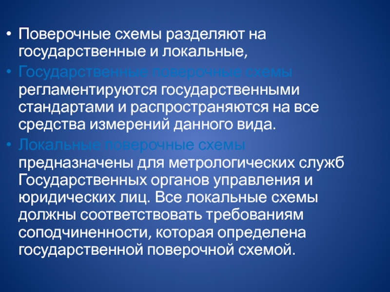 Локальные поверочные схемы предназначены для метрологических служб Государственных органов управления и юридических лиц. Все локальные схемы должны соответствовать требованиям соподчиненности, которая определена государственной поверочной схемой.