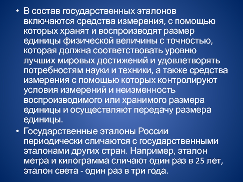 Государственные эталоны России периодически сличаются с государственными эталонами других стран. Например, эталон метра и килограмма сличают один раз в 25 лет, эталон света - один раз в три года.