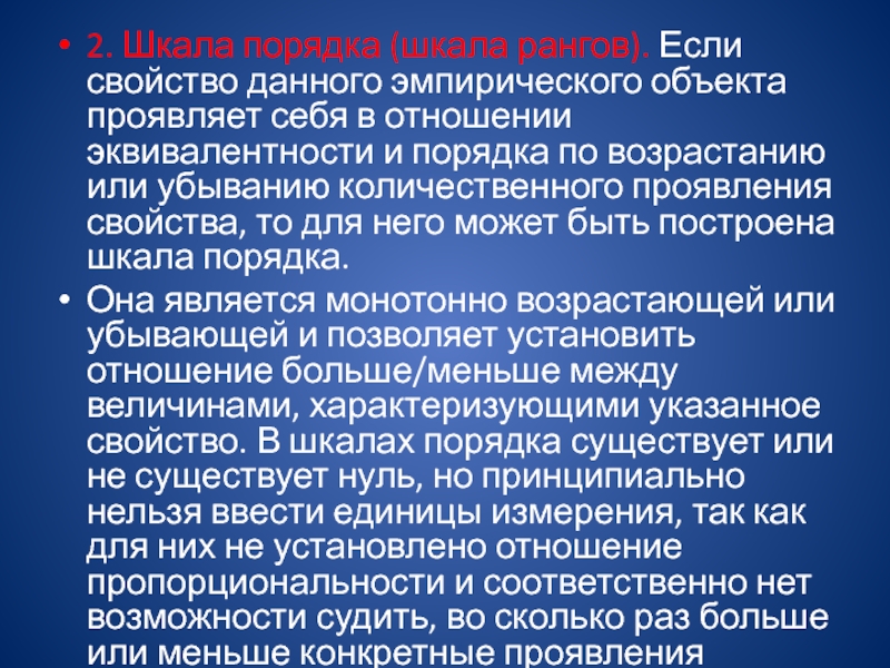 Она является монотонно возрастающей или убывающей и позволяет установить отношение больше/меньше между величинами, характеризующими указанное свойство. В шкалах порядка существует или не существует нуль, но принципиально нельзя ввести единицы измерения, так как для них не установлено отношение пропорциональности и соответственно нет возможности судить, во сколько раз больше или меньше конкретные проявления свойства.