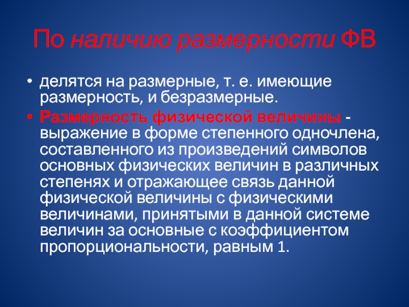 степенного одночлена, составленного из произведений символов основных физических величин в различных степенях и отражающее связь данной физической величины с физическими величинами, принятыми в данной системе величин за основные с коэффициентом пропорциональности, равным 1.