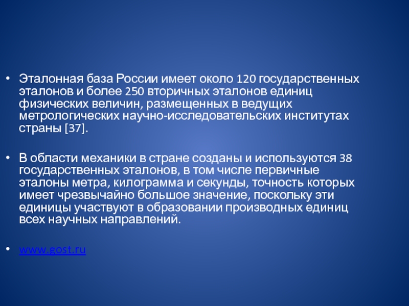 Слайд 75Эталонная база России имеет около 120 государственных эталонов и более