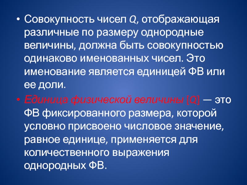 Слайд 12Совокупность чисел Q, отображающая различные по размеру однородные величины, должна