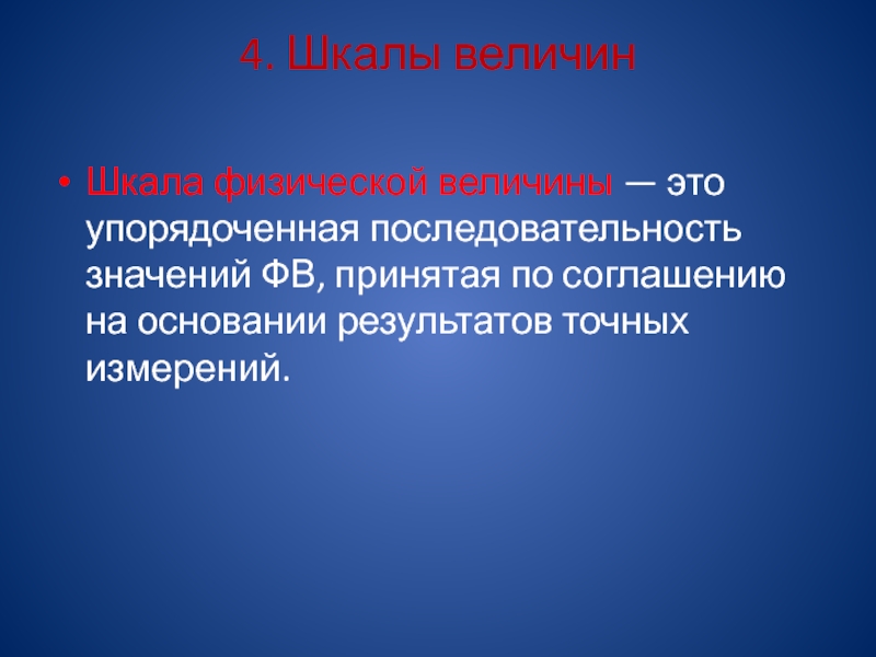 Шкала величины — упорядоченная последовательность ее значений, принятая по соглашению на основании результатов точных измерений.