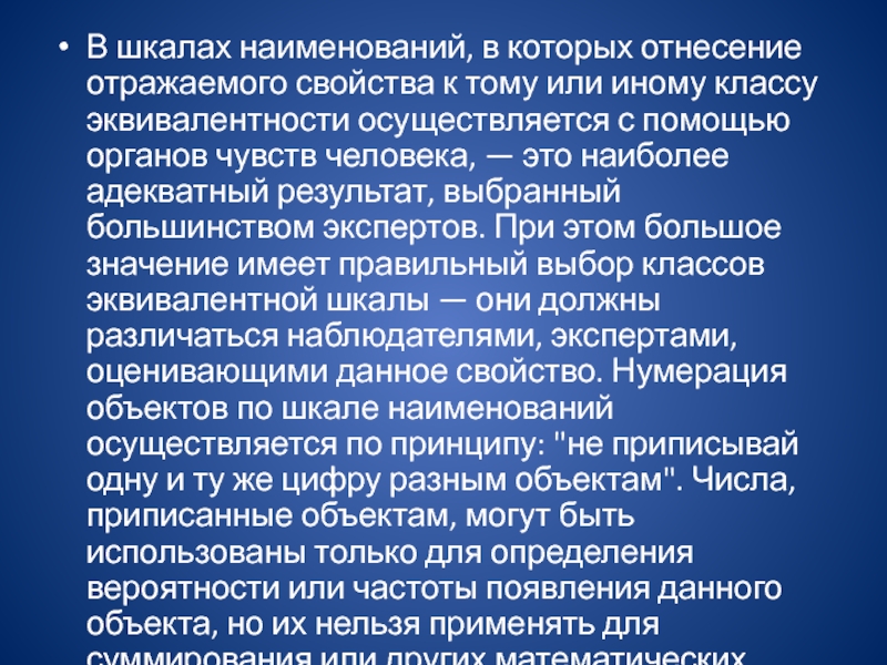 — это наиболее адекватный результат, выбранный большинством экспертов. При этом большое значение имеет правильный выбор классов эквивалентной шкалы — они должны различаться наблюдателями, экспертами, оценивающими данное свойство. Нумерация объектов по шкале наименований осуществляется по принципу: "не приписывай одну и ту же цифру разным объектам". Числа, приписанные объектам, могут быть использованы только для определения вероятности или частоты появления данного объекта, но их нельзя применять для суммирования или других математических операций.