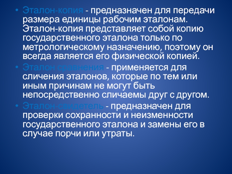 Слайд 72Эталон-копия - предназначен для передачи размера единицы рабочим эталонам. Эталон-копия