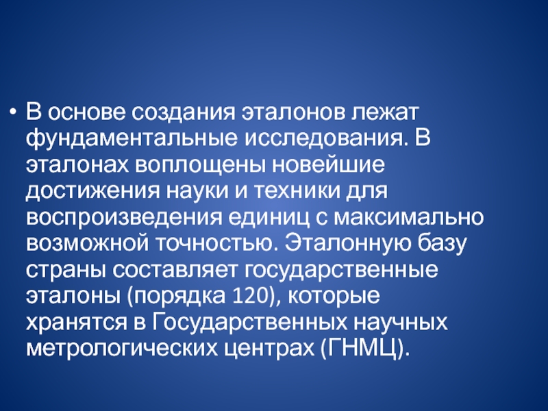 Слайд 61В основе создания эталонов лежат фундаментальные исследования. В эталонах воплощены