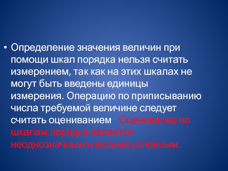 Слайд 23Определение значения величин при помощи шкал порядка нельзя считать измерением,