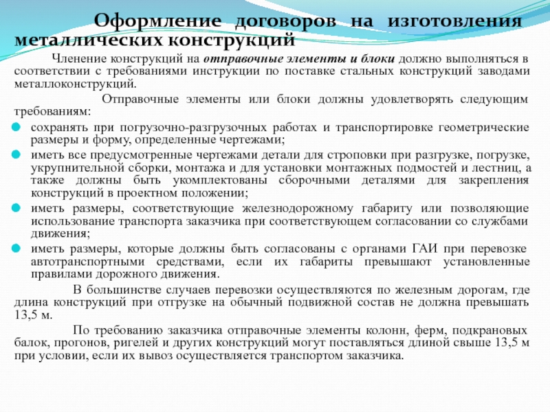 По требованию заказчика отправочные элементы колонн, ферм, подкрановых балок, прогонов, ригелей и других конструкций могут поставляться длиной свыше 13,5 м при условии, если их вывоз осуществляется транспортом заказчика.