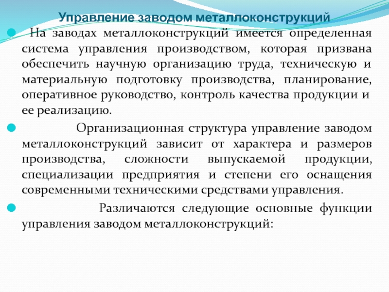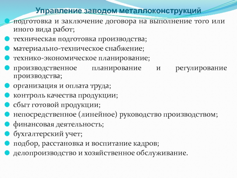 Различаются следующие основные функции управления заводом металлоконструкций: