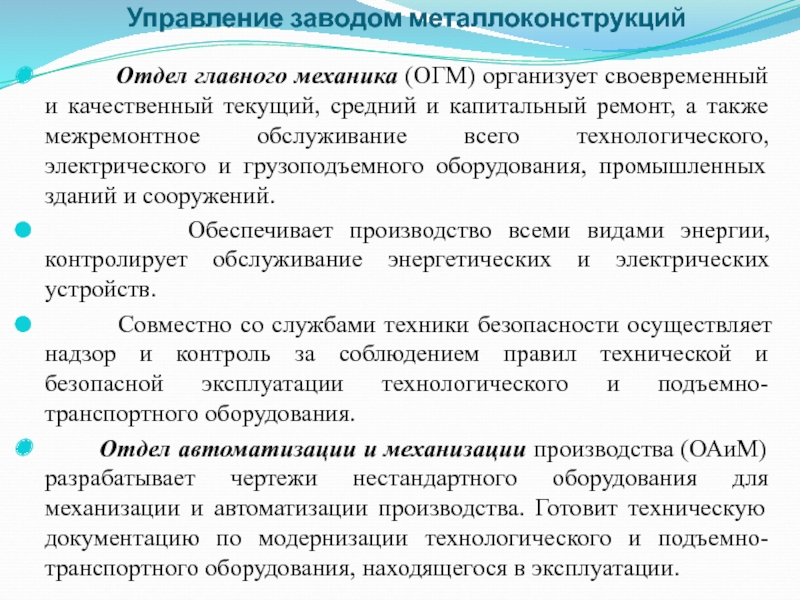 Отдел главного механика (ОГМ) организует своевременный и качественный