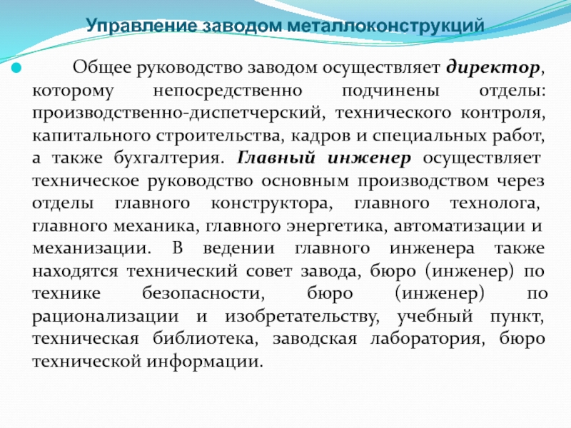 заводом осуществляет директор, которому непосредственно подчинены отделы: производственно-диспетчерский, технического контроля,