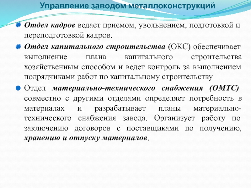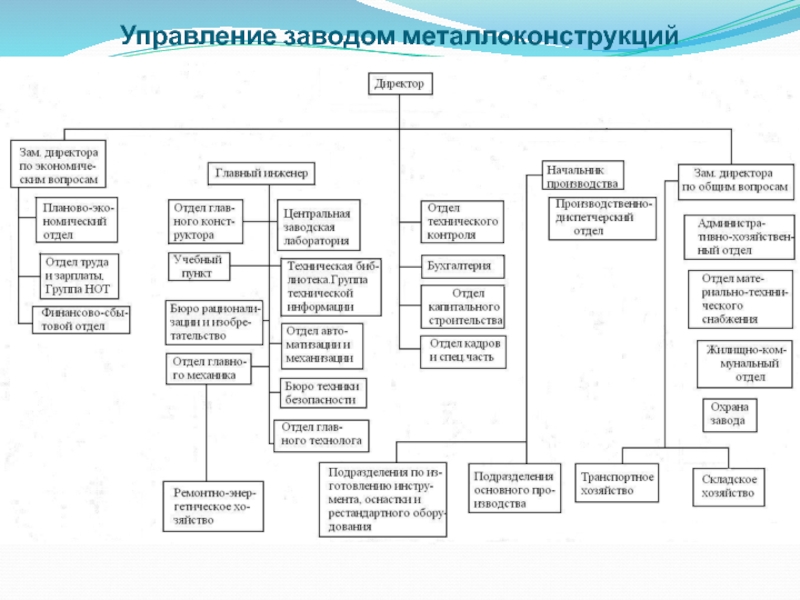 Организационная структура управление заводом металлоконструкций зависит от характера и размеров производства, сложности выпускаемой продукции, специализации предприятия и степени его оснащения современными техническими средствами управления.